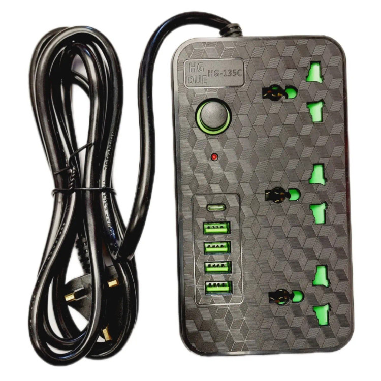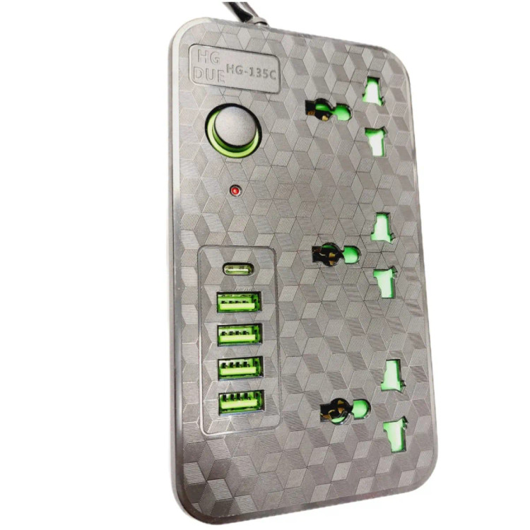 سه راهی برق HGDUE مدل HG-135 دارای 3 عدد پریز یونیورسال UNIVERSAL و 4 عدد پورت USB و 1 عدد پورت تایپ سی و یک عدد کلید خاموش و روشن است. طول سیم این چندراهی برق 2.0 متر است و روکش آن PVC می باشد که دربرابر کشیدگی و آسیب مقاوم می باشد. حداکثر توان قابل تحمل عبوری 2500 وات می باشد. مزیت دیگر این چندراهی برق HG-135C سوکت های یونیورسال آن است که هم دارای پوشش محافظ کودک و هم قابلیت اتصال دوشاخه و هم سه شاخه های اروپایی است. حداکثر شدت جریان قابل انتقال پورت های USB برابر 3.4 آمپر اتوماتیک (فست شارژ) است.