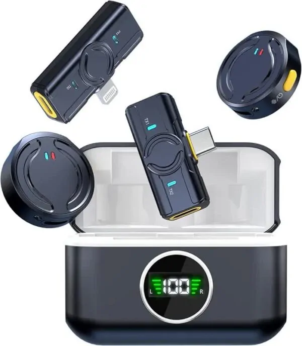 زیباسازی صدا با افکت پژواک مانیتورینگ دوطرفه و همزمان باتری با ظرفیت بالا اتصال خودکار شارژ همزمان با استفاده واقعن با کیفیت هستش خیلی خوبه امتحان پس داده رنگ مشکی دو میکروفن سکه ایی درگاه شارژ تایپسی دارای مانیتور روی کیس دارای مگنت بسیار قوی روی میکروفن ها